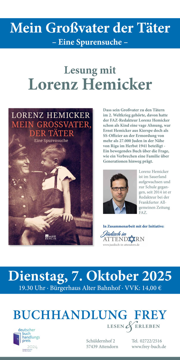 In Zusammenarbeit mit der Initiative „Jüdisch in Attendorn im Heimatverein“ lädt die Buchhandlung Frey aus Attendorn zur Buchlesung „Mein Großvater, der Täter – Eine Spurensuche“ mit Autor Lorenz Hemicker am Dienstag, 7. Oktober 2025, um 19:30 Uhr in das Bürgerhaus „Alter Bahnhof“ ein.